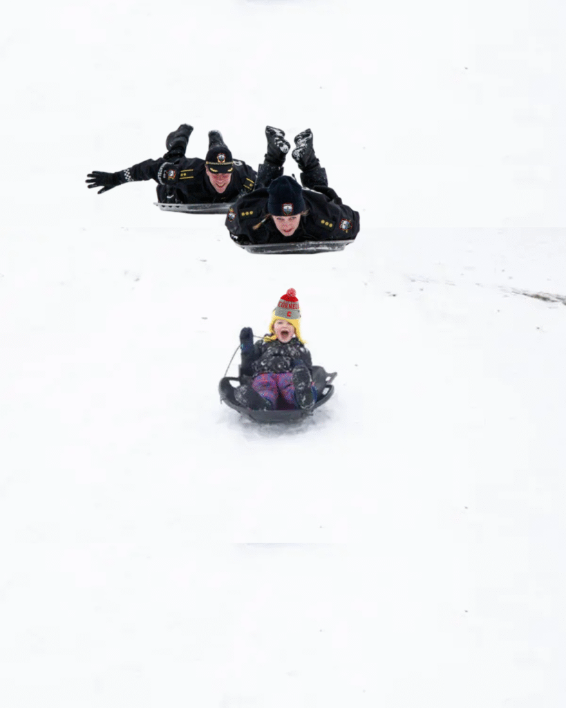 Catch Me If You Can! CUPD Seen Sledding Down Slope in Pursuit of Evil Students Vandalizing Libe Slope with Evil Sleds